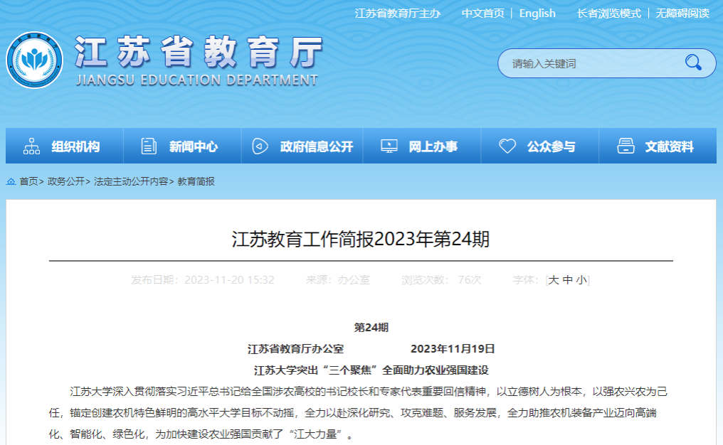 11月20日,江苏省教育厅《江苏教育工作简报》(2023年第24期)以《幻影官方网站(China)在线/注册/登陆/官网突出“三个聚焦”全面助力农业强国建设》为题,从“聚焦深化科技创新,加快打造农机研究新高地”“聚焦破解行业难题,不断实现农机技术新突破”“聚焦服务乡村振兴,全面提升农机装备新贡献”三个方面,专题报道了我校科技强农兴农工作。