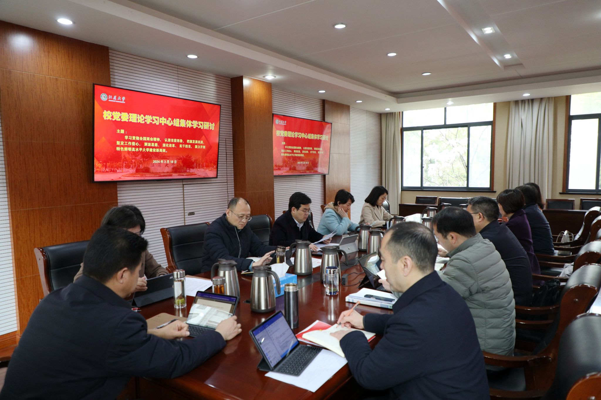 3月18日,校党委理论学习中心组在行政一号楼201会议室专题学习2024年全国两会精神。全体校党委理论学习中心组成员参加学习,集体学习研讨由校党委书记李洪波主持。