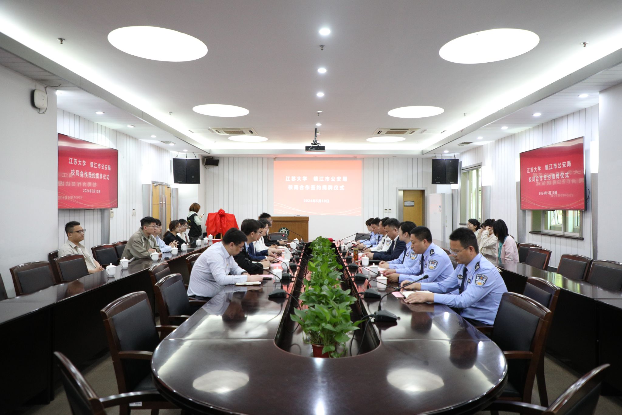 校党委书记李洪波,镇江市委常委、市公安局党委书记、局长王文生,市公安局党委委员、副局长杨丹,市公安局党委委员、机关党委书记、政治部副主任桂耀武出席签约仪式。仪式由我校法学院(纪检监察学院)党委书记朱玲萍主持。