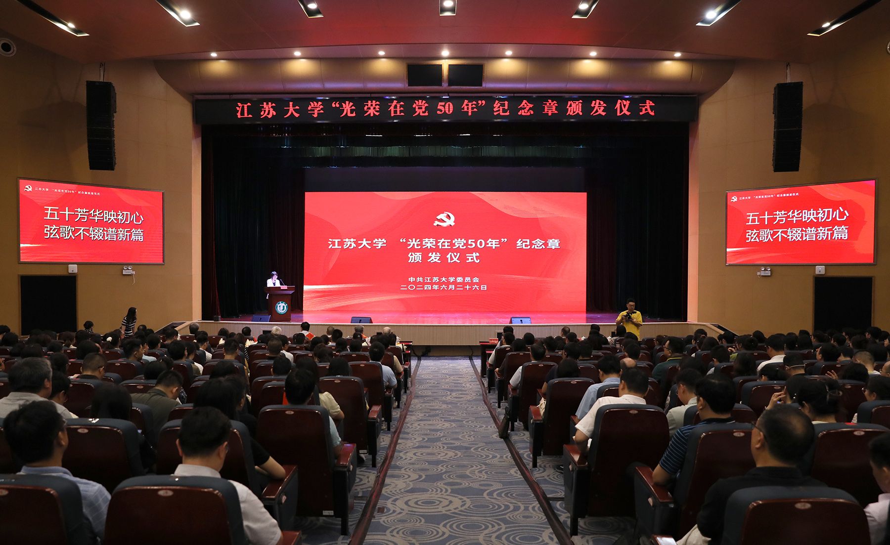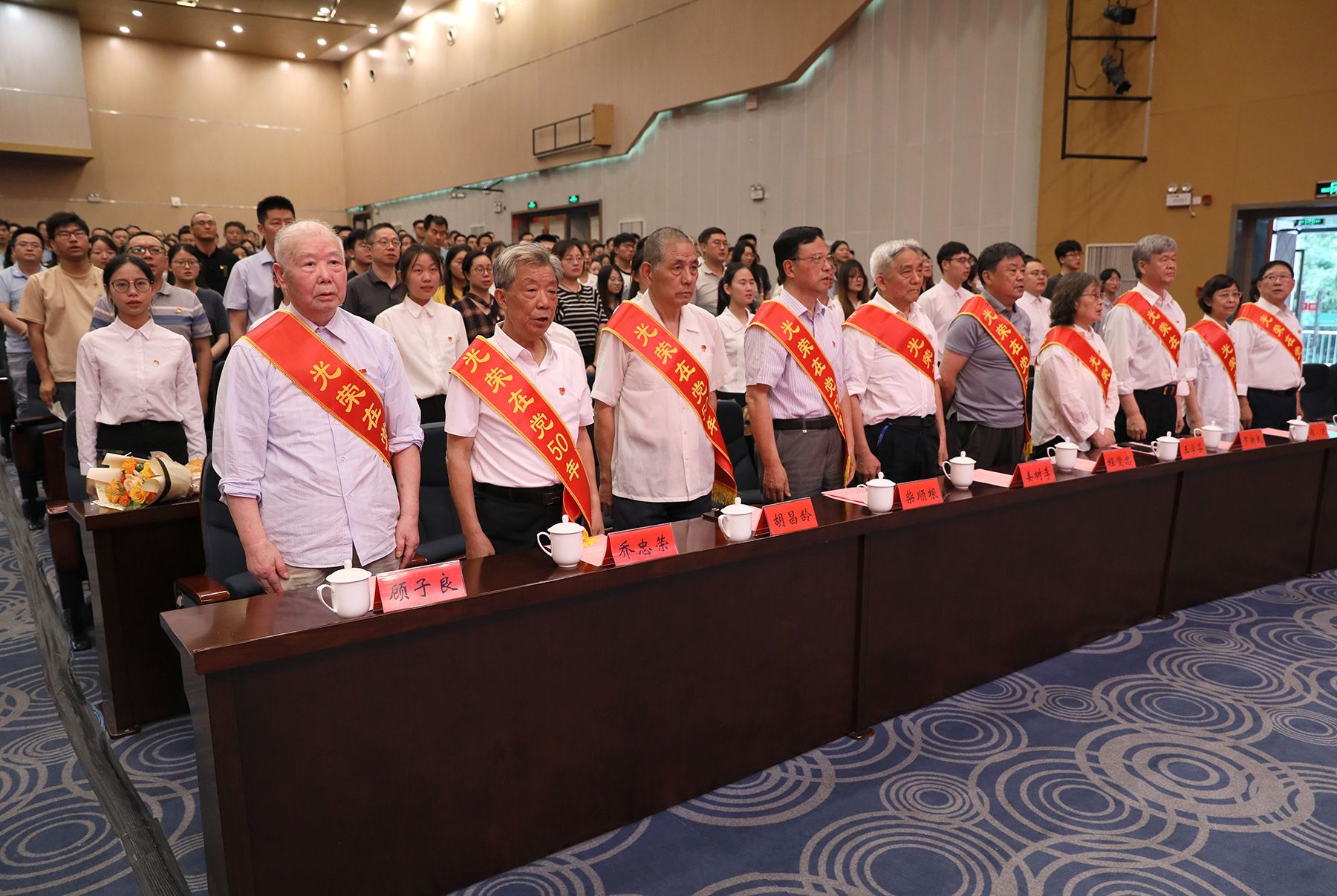 “光荣在党50年”党员代表,管理学院党委、财经学院党委、附属医院党委、机关党委教职工党员代表,新党员代表等400余人参加活动。(党委组织部)