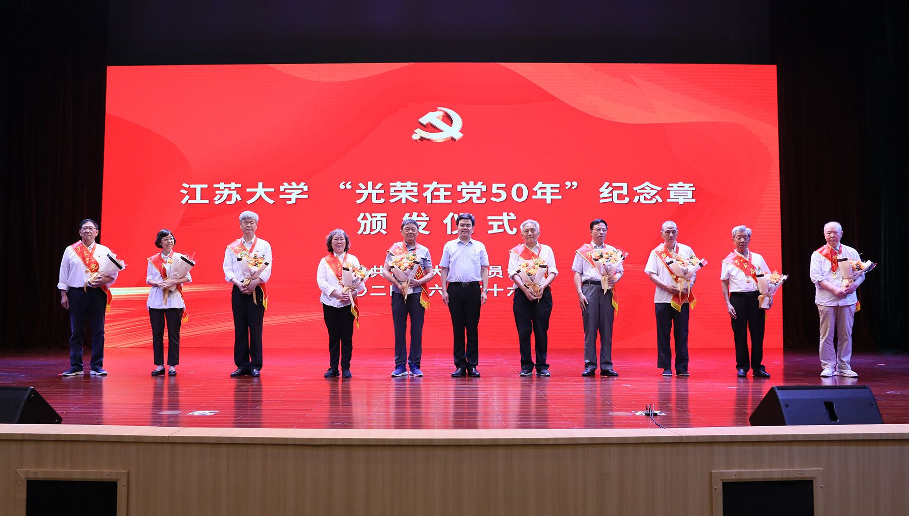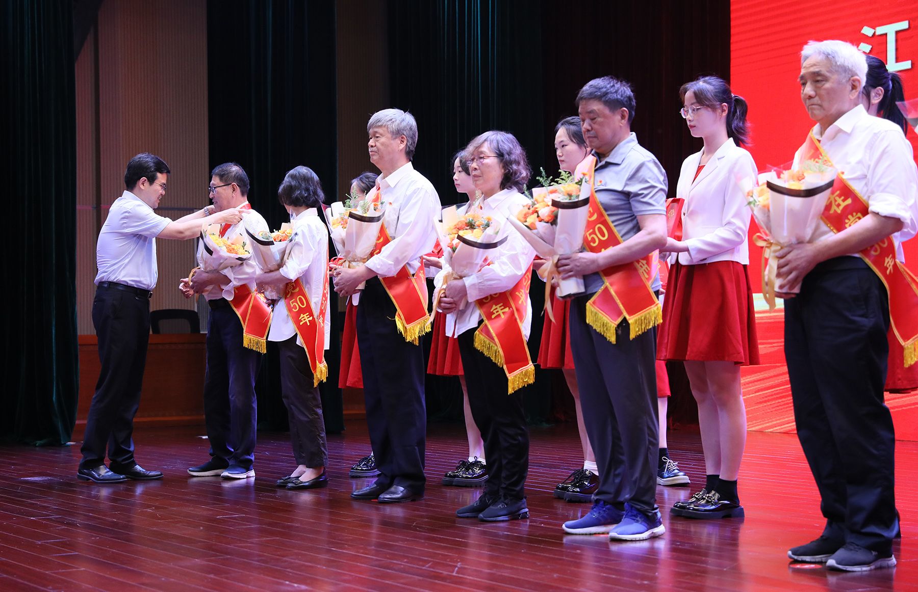 在“光荣在党50年”纪念章颁发仪式上,李洪波为到场的10位老党员顾子良、乔忠荣、胡昌龄、柴顺根、姜树李、程燮忠、王学芬、罗新民、闫述、张燎明颁发“光荣在党50年”纪念章并合影留念,10名新党员代表向老党员献花致敬。
