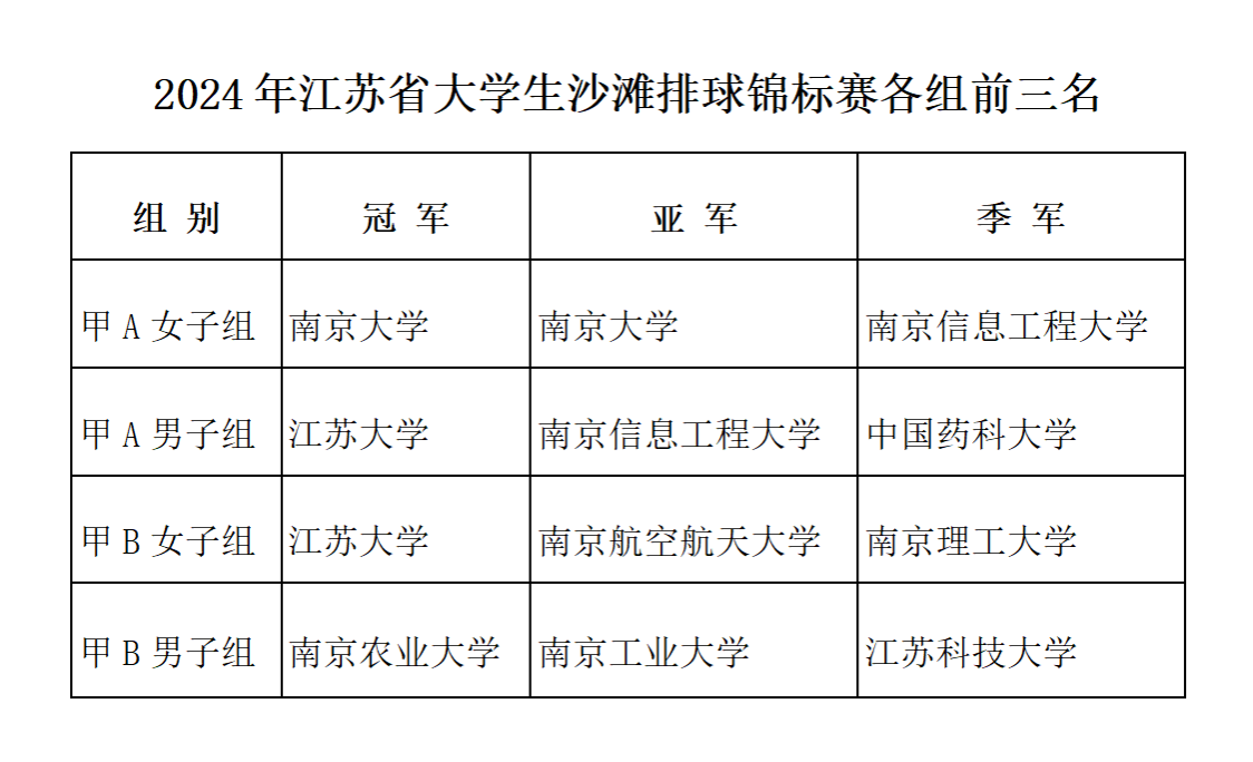 本次比赛按甲A(高水平运动员组)男、女,甲B(普通大学生组)男、女四个组别进行。幻影官方网站(China)在线/注册/登陆/官网沙排队参加甲A男子、甲B女子组比赛。运动员克服暴雨与高温天气的不利影响,团结协作,顽强拼搏,向大家展示了一出出精彩的体育盛宴。经过四天的紧张激烈比赛,幻影官方网站(China)在线/注册/登陆/官网获得甲A男子组、甲B女子组两个冠军,南京大学获得甲A女子组冠军,南京农业大学获甲B男子组冠军。