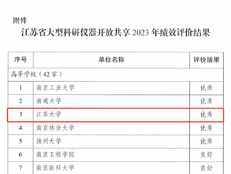 近日,江苏省科技资源统筹服务中心发文,公布2023年江苏省重大科研基础设施和大型科研仪器开放服务绩效评价结果。我校连续四年获评优秀等次。