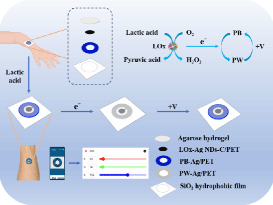 为解决上述问题,该工作以汗液中的乳酸(LA)作为目标分析物,构建了一种基于酶生物燃料电池的可视化传感贴片。检测过程中,利用亲水性琼脂糖水凝胶和疏水SiO2膜协同调控汗液的收集与排出;利用电极上修饰的乳酸氧化酶将LA氧化为丙酮酸,实现化学能向电能的转换。所产生的电子从外电路转移至阴极,进一步将阴极表面修饰的普鲁士蓝(PB,着色态)还原为普鲁士白(PW,褪色态)。通过裸眼观察可以实现LA半定量检测,或结合手机APP输出的RGB值实现定量检测。为降低测试成本,可对贴片施加电压使PW氧化为PB,电极由褪色态再次变为着色态,从而实现传感器贴片的重复使用。该工作为汗液乳酸监测提供了新方法,同时为可视化可穿戴传感器构建提供了新策略。