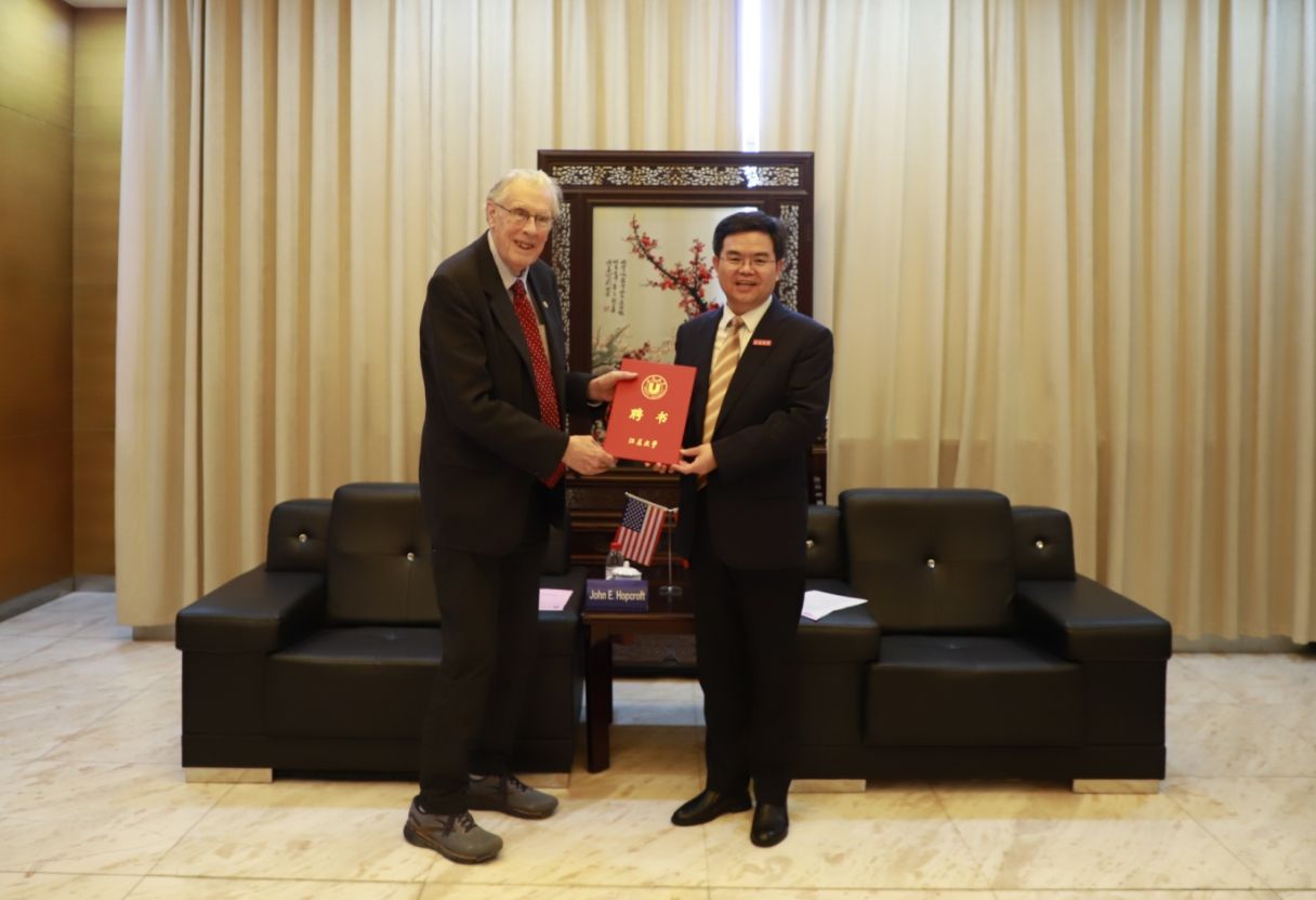 对话会上,邢卫红向约翰·爱德华·霍普克罗夫特教授颁发“幻影官方网站(China)在线/注册/登陆/官网学习科学与技术交叉学科带头人”聘书。