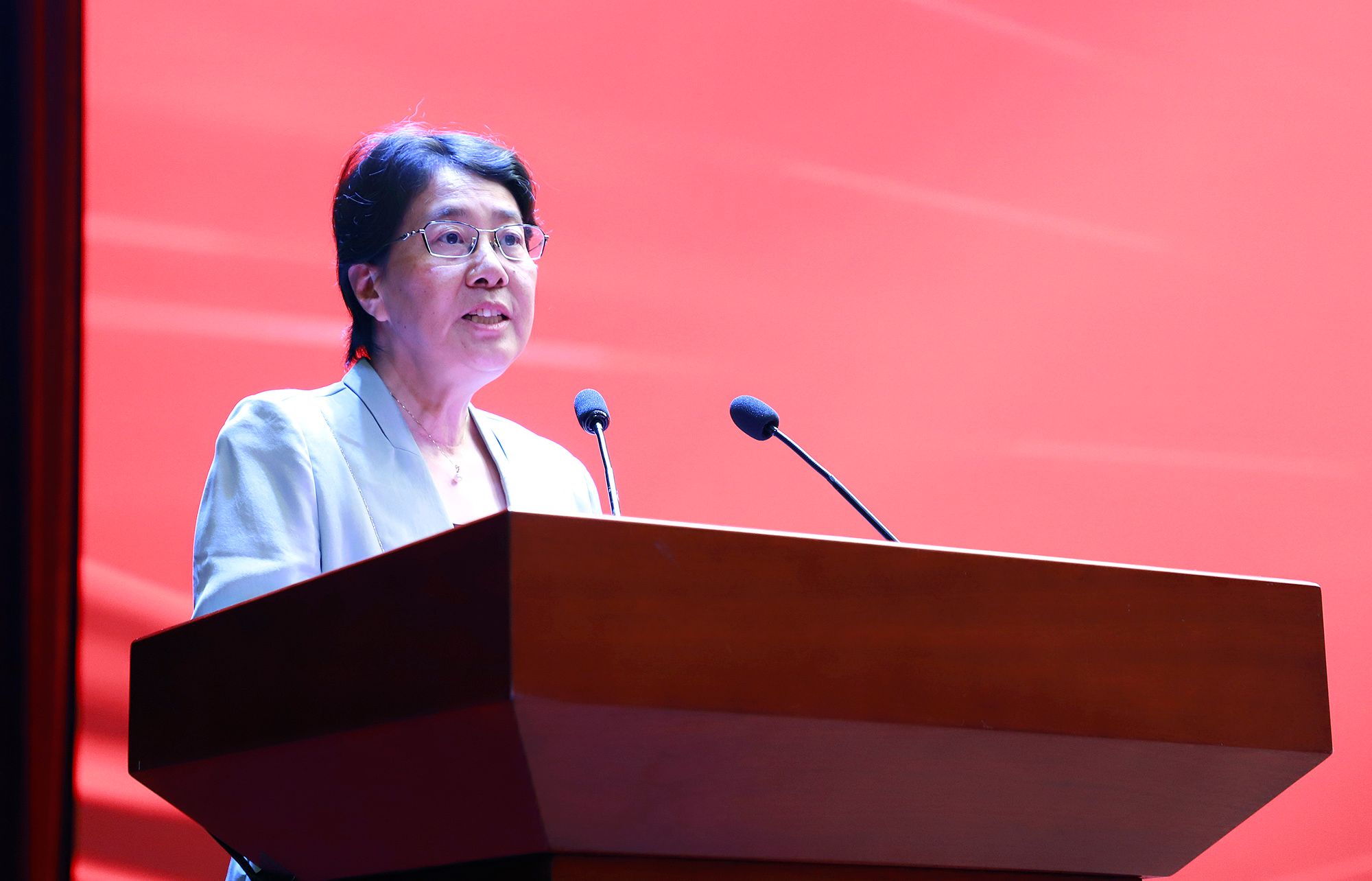 邢卫红致辞,代表学校向光荣退休的教职工表示衷心感谢并致以崇高敬意,向新入职的教职工表示热烈欢迎,向受到表彰的优秀教师表示热烈祝贺,并向全校教师致以节日的问候。邢卫红说,强国必先强教,强教必先强师,一流的师资队伍是学校高质量发展的基石。学校始终将人才作为发展的第一资源,深入实施“人才强校”战略,全面推进人才荟萃竞秀行动,加快打造高水平人才集聚高地。她表示,在广大教师的辛勤付出下,学校事业高质量发展取得了新成效,学校发展更有温度、更有高度、更有希望。邢卫红指出,高校教师要想站稳讲台、引领前沿,担起传播思想、传播真理、塑造灵魂的时代重任,需要不断提升自我、强大自我。她与大家交流了三点意见:一是用“春风化雨”的德行引领学生成长;二是用“授人以渔”的智慧推动教学相长;三是用“顶天立地”的学术成果彰显价值担当。邢卫红表示,学校愿做老师们最坚实的后盾,努力搭建发展平台、优化管理服务,进一步营造尊重教师的浓厚氛围,让老师们安心从教、舒心工作、静心育人。