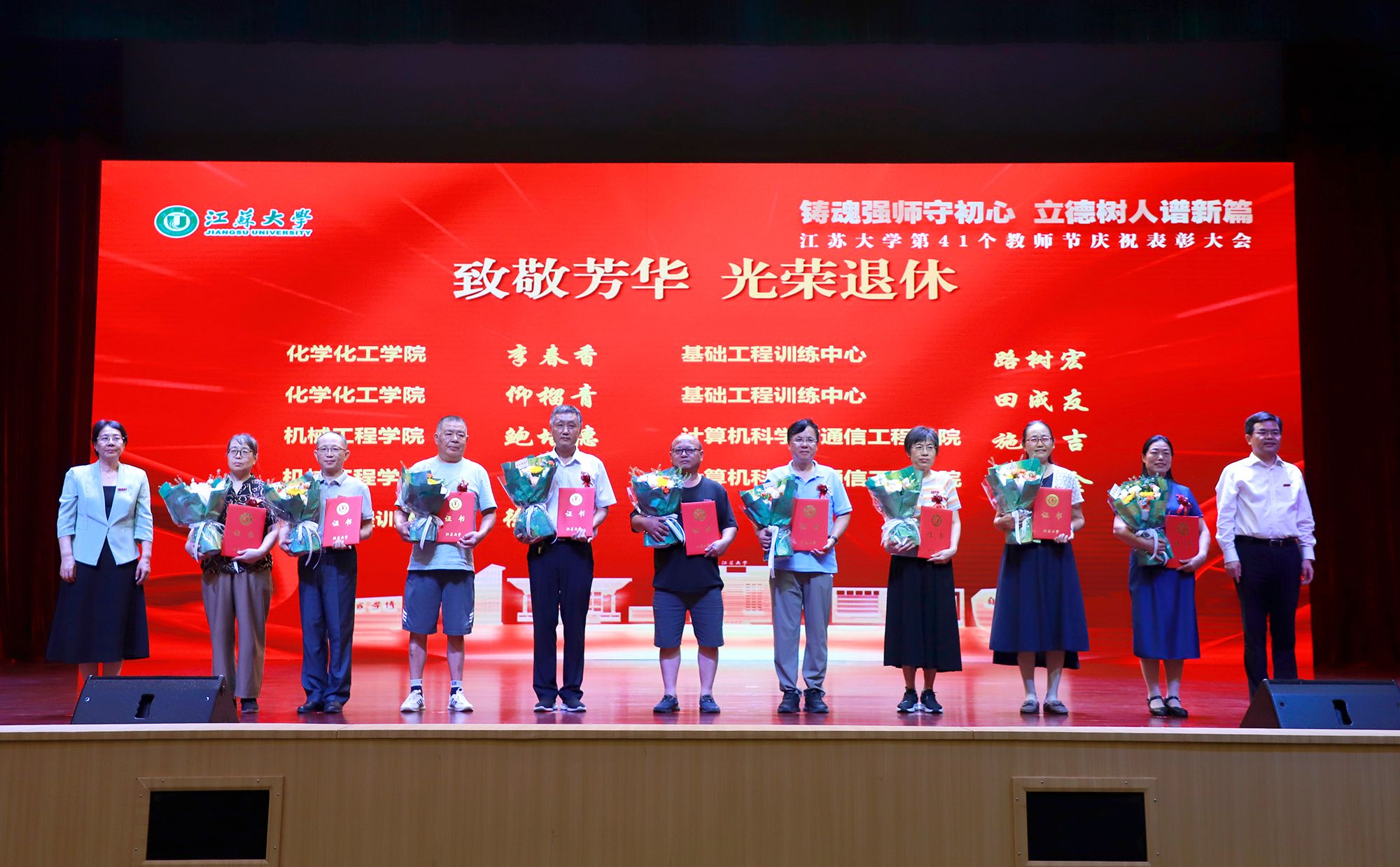 大会举行了荣休仪式,李洪波、邢卫红为荣休教师赠送鲜花和颁发荣休证书。