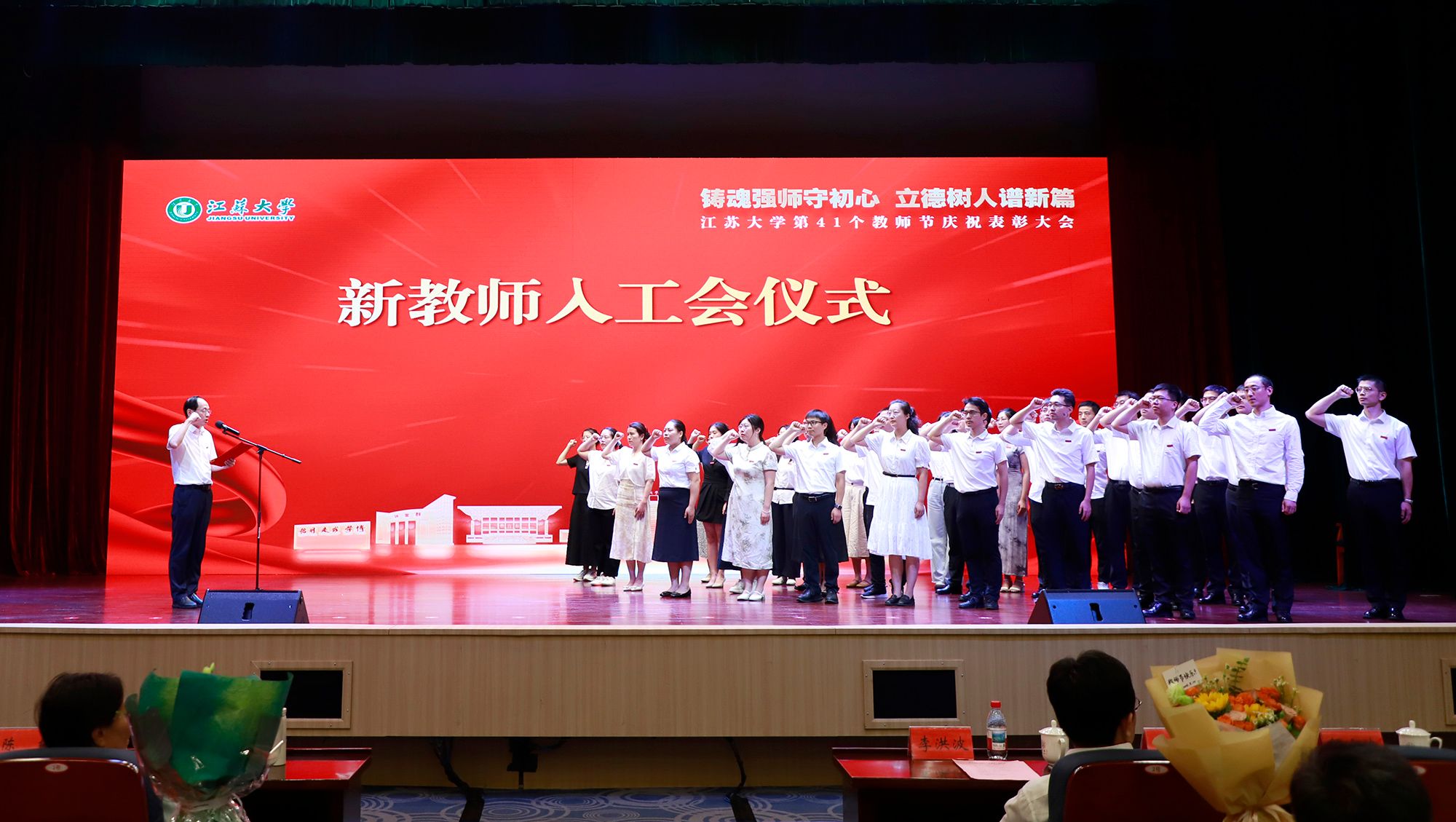 大会举行了2025年新教师入职、入工会仪式。党委教师工作部部长、人事处处长王飞,校工会常务副主席王善民分别带领新教师在入职仪式和入工会仪式上宣誓。环境与安全工程学院教师张立代表新教师发言。