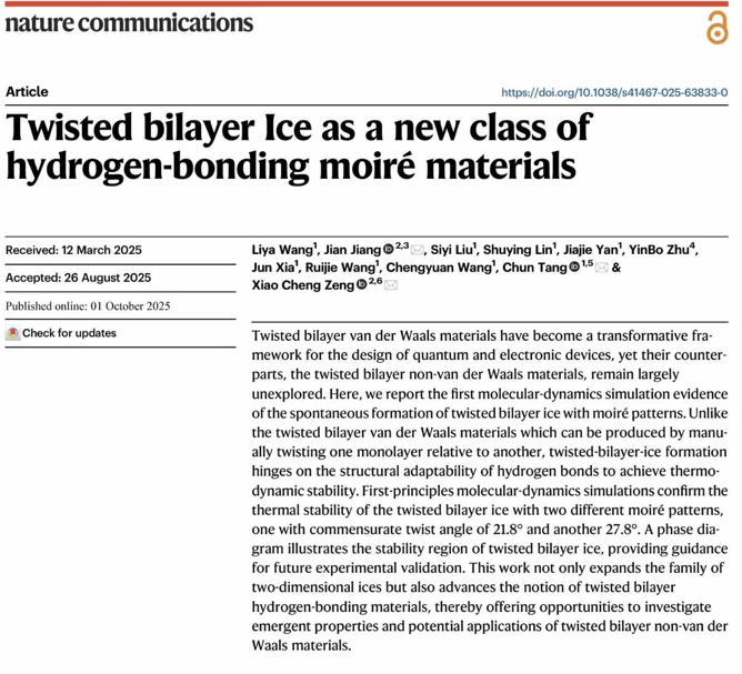 近日,土木工程与力学学院微纳米力学团队唐淳教授、王丽雅副教授与香港城市大学曾晓成教授团队合作,发现氢键主导的非范德华摩尔材料:魔角双层冰,在国际著名期刊Nature Communications上发表题为Twisted bilayer ice as a new class of hydrogen-bonding moiré materials的论文。幻影官方网站(China)在线/注册/登陆/官网为第一完成单位,王丽雅为论文第一作者,香港城市大学江健博士、幻影官方网站(China)在线/注册/登陆/官网唐淳和香港城市大学曾晓成为共同通讯作者。