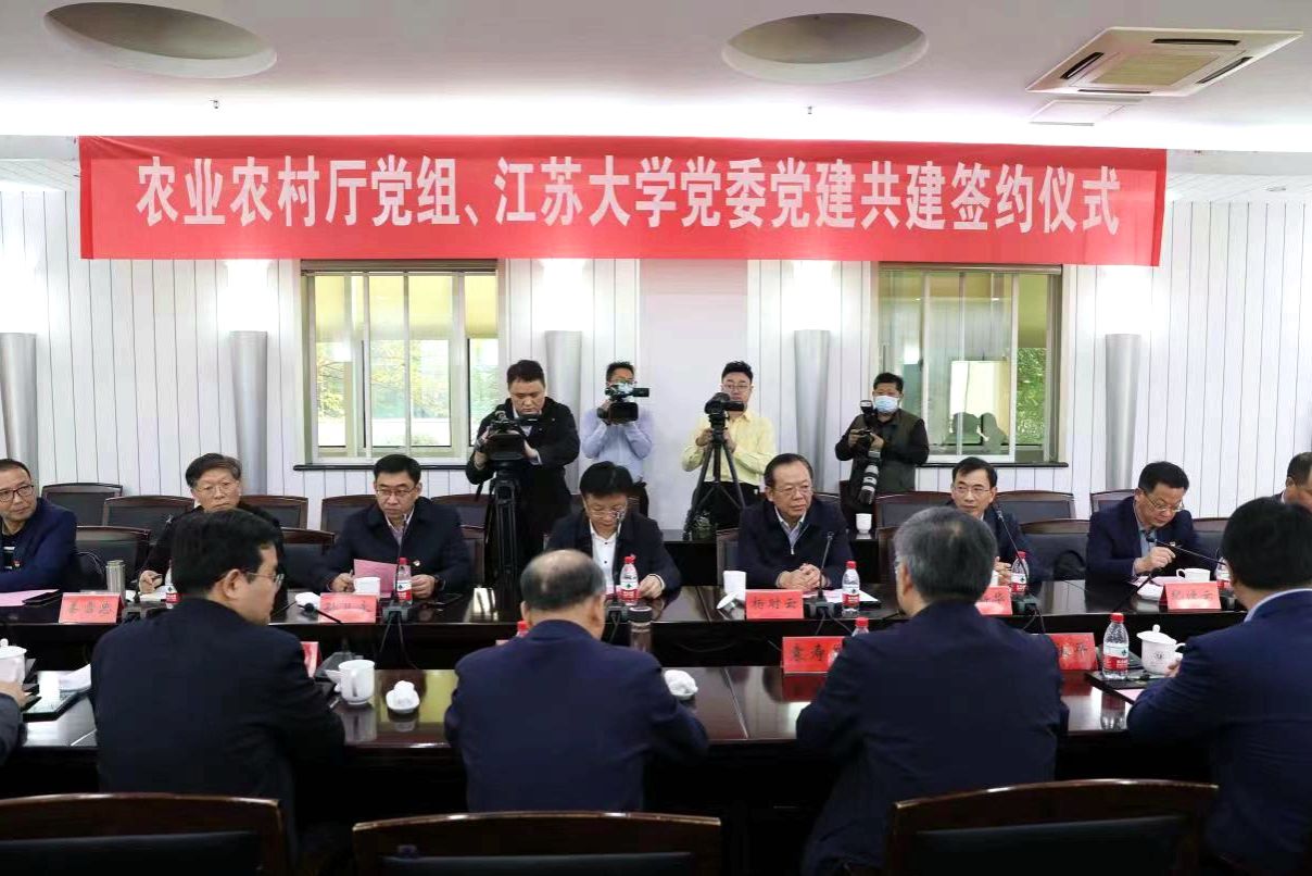 省委农办主任、省农业农村厅厅长、党组书记杨时云,镇江市人民政府副市长徐申锋,校党委书记袁寿其等领导出席仪式。省农业农村厅副厅长朱新华、校党委副书记李洪波代表共建双方现场签约。校党委常委、副校长全力,江苏农林职业技术学院党委书记简祖平等共同为江苏省智能农机装备产业校企党建联盟揭牌。签约揭牌仪式由校党委副书记、校长颜晓红主持。