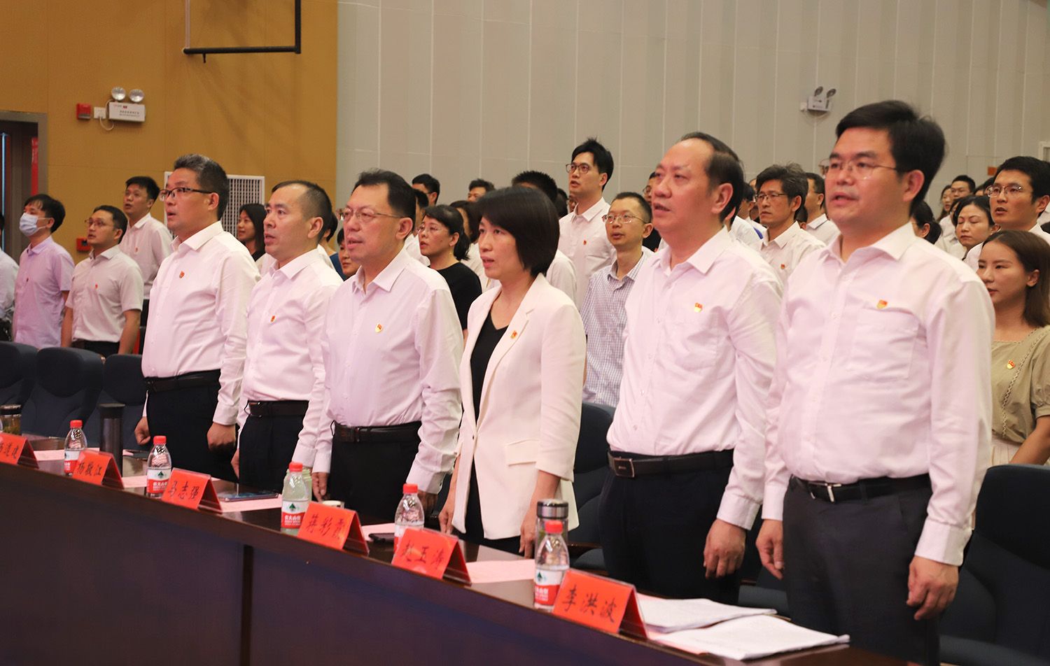 会上,全体起立,奏唱国歌。