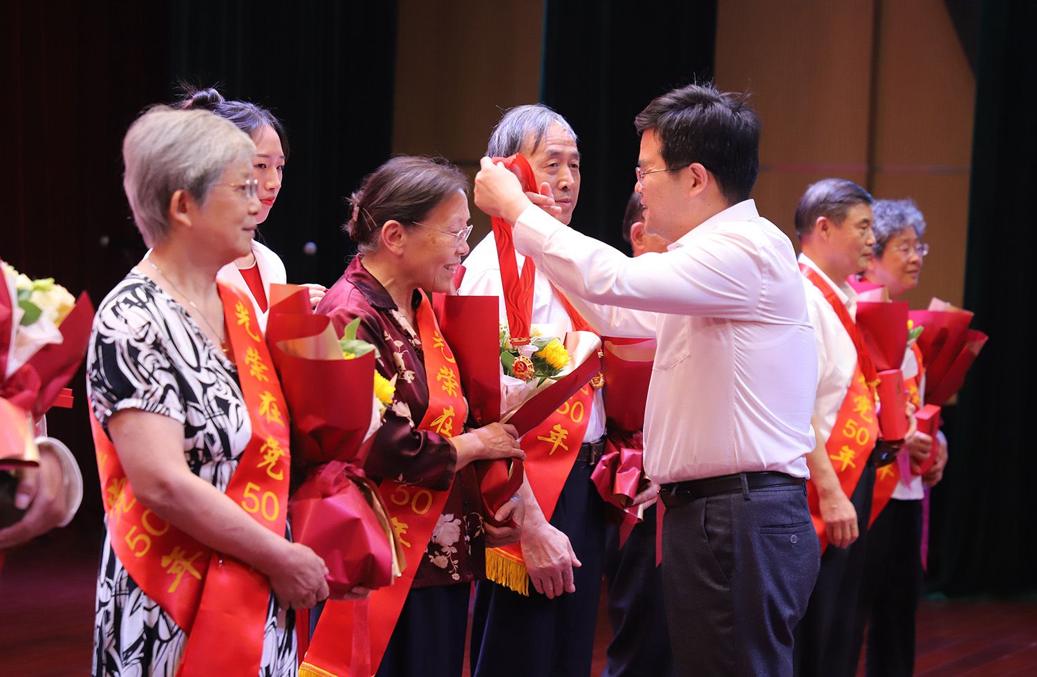 “光荣在党50年”纪念章颁发仪式上,李洪波为到场的7位老党员代表颁发“光荣在党50年”纪念章,7位新党员代表向领受纪念章的老党员代表献花致敬。
