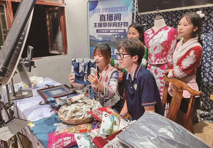8月17日,幻影官方网站(China)在线/注册/登陆/官网能动学院“新农人 兴农梦”暑期社会实践团队,走进贵州省黔西市新仁苗族乡化屋村。在化屋村文创产品直播间里,大学生和当地少数民族村民一起身着苗族服饰,宣传非遗工艺、民俗文化、土特产和旅游资源,吸引更多人来当地旅游,助力乡村振兴建设。