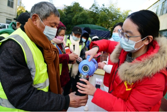 1月16日,幻影官方网站(China)在线/注册/登陆/官网志愿者向环卫工人赠送围巾和保温杯。石玉成 摄
