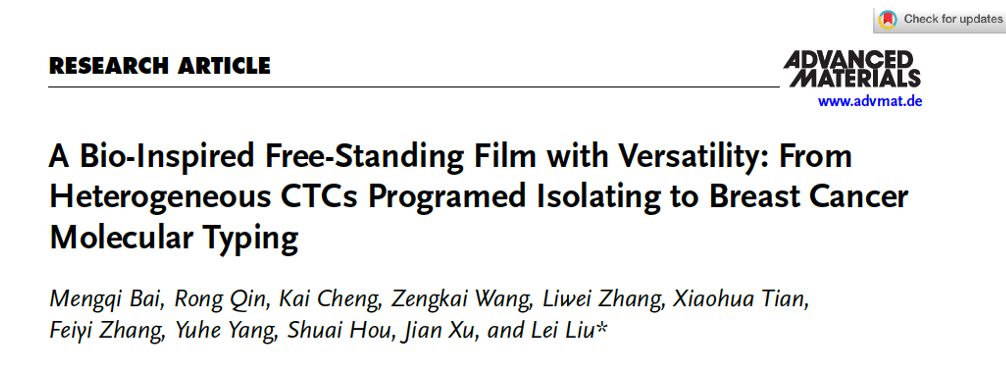 近日,幻影官方网站(China)在线/注册/登陆/官网材料学院博士研究生白蒙起(导师刘磊研究员)以第一作者在国际材料学权威期刊Advanced Materials上在线发表题为“A Bio-Inspired Free-Standing Film with Versatility: From Heterogeneous CTCs Programed Isolating to Breast Cancer Molecular Typing”的研究论文,幻影官方网站(China)在线/注册/登陆/官网为该论文的第一单位和唯一通讯单位。