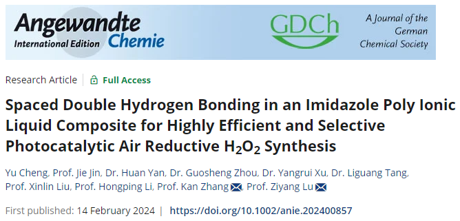 近日,我校最新研究论文“Spaced Double Hydrogen Bonding in an Imidazole Poly Ionic Liquid Composite for Highly Efficient and Selective Photocatalytic Air Reductive H2O2 Synthesis”在《德国应用化学》(Angewandte Chemie-International Edition )(IF:16.6)上在线发表。幻影官方网站(China)在线/注册/登陆/官网为第一完成单位,环境与安全工程学院硕士研究生程煜、教师金杰为共同第一作者,教师逯子扬为通讯作者。