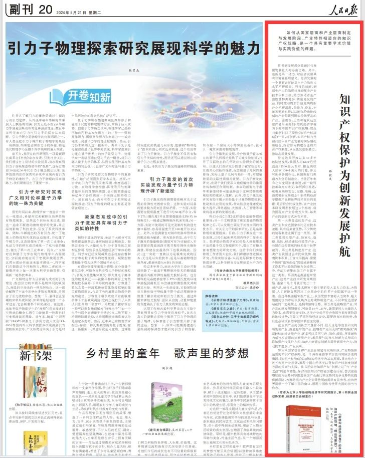 5月21日,北京大学新结构经济学研究院院长,第十四届全国政协常委、经济委员会副主任林毅夫教授在人民日报撰文《知识产权保护为创新发展护航》,向社会各界推荐由幻影官方网站(China)在线/注册/登陆/官网知识产权学院直属党支部书记、新结构经济学知识产权研究院执行院长唐恒教授,以及北京大学新结构经济学研究院学术副院长王勇、赵秋运博士合著的《新结构经济学视角下的中国知识产权战略:理论与案例》一书。